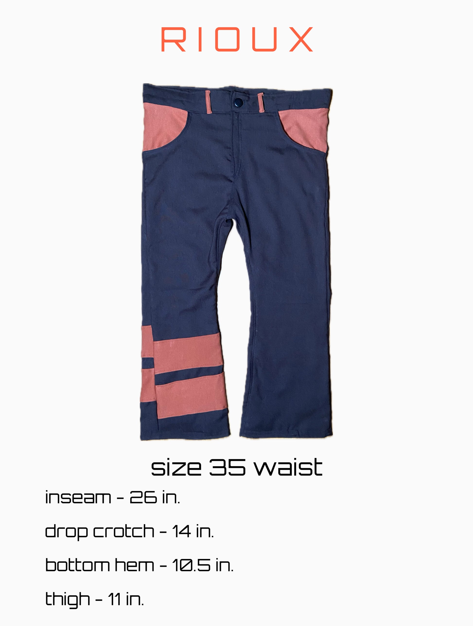 - orange belt loops, front / back pockets, & panels on bottom leg.